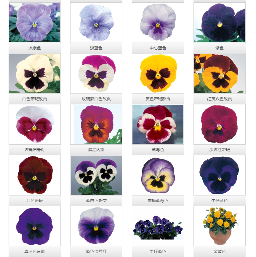 極大花型,發芽:18-24℃,7-12天 。種植者:極大的花型可以在秋季和晚春溫暖的條件下持續保持。在少于14個小時的漸少日照條件下播種后,從秋季到次年春季,依然保持緊湊的株型,沒有徒長。幾乎不需要使用植物生長調節劑。雖然株型緊湊,但卻會很快長滿整個盆缽,生產流程快,利潤高。豐花性強,在整個秋季和冬季都可以持續上花。 零售者:在緊湊的株型上,花卉量非常豐富,特殊的漸變花色應用于盆栽和花壇展示中非常漂亮。晚秋時節貨架期長,花卉量豐富。 消費者:從秋季、冬季到春季的整個生長過程中,一直都會持續開花,并且都保持著巨大的花型,屬于花色分類非常豐富的巨花型三色堇。