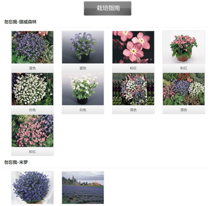 藍色株高約20厘米,比它的姊妹顏色‘粉紅色’株型更緊湊一些,花中度藍色。卓越的盆栽品種。粉紅株高約20厘米,花為鮮艷的粉紅色,植株強健。 白色株高約20厘米,花雪白色,株型緊湊,理想的盆栽產品。