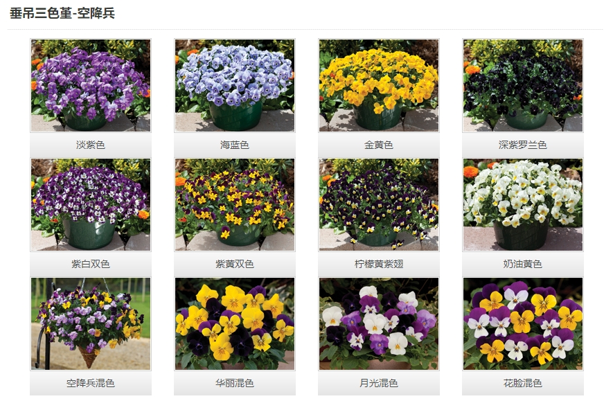 株高15-20厘米,冠幅30-40厘米。轟動的育種突破,是真正冬季開花的由種子繁殖垂吊三色堇!空降兵系列垂吊性非常完美,能形成瀑布型的垂吊效果?;慷?,中等花朵,花徑5-6厘米。植株低矮,不易徒長,對日照不敏感,在冬季可持續開花。適合種植于各種吊籃、窗臺容器中。