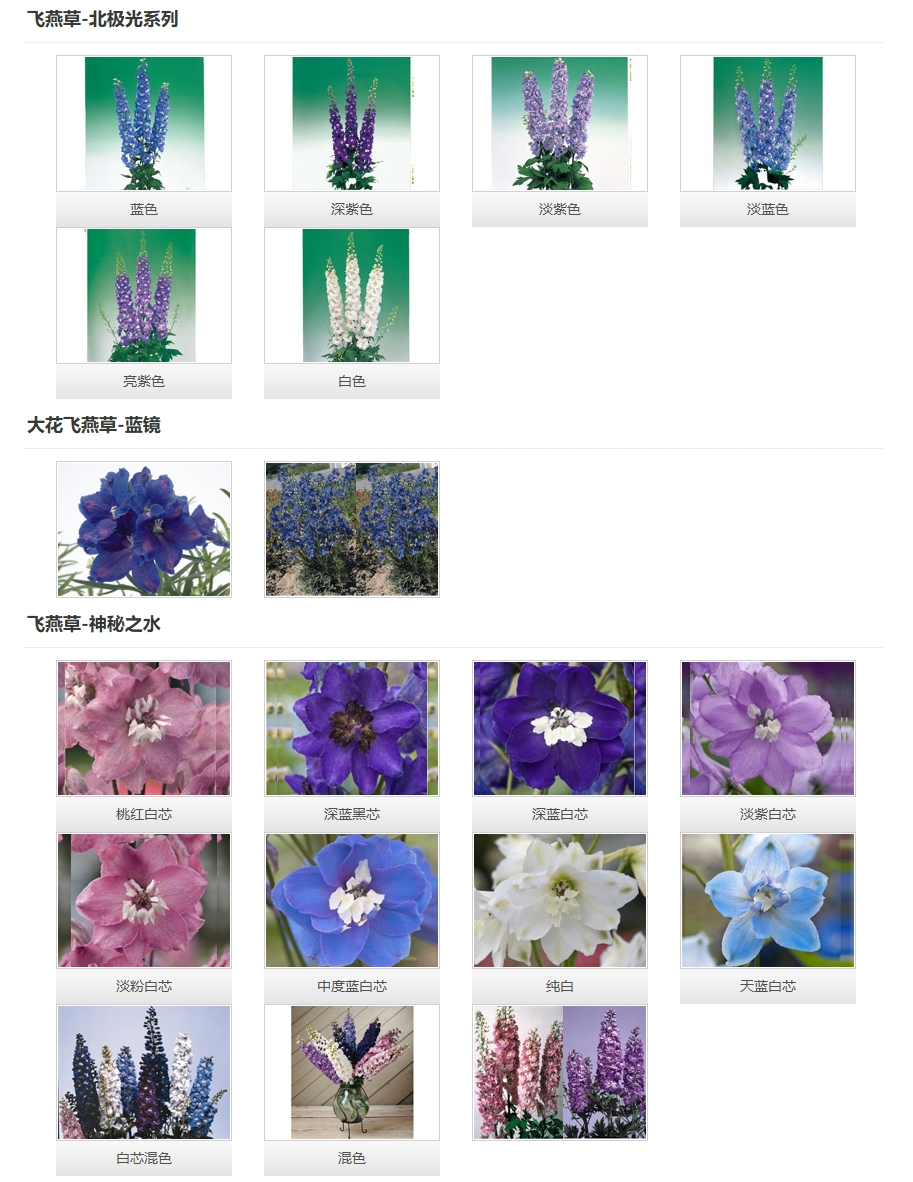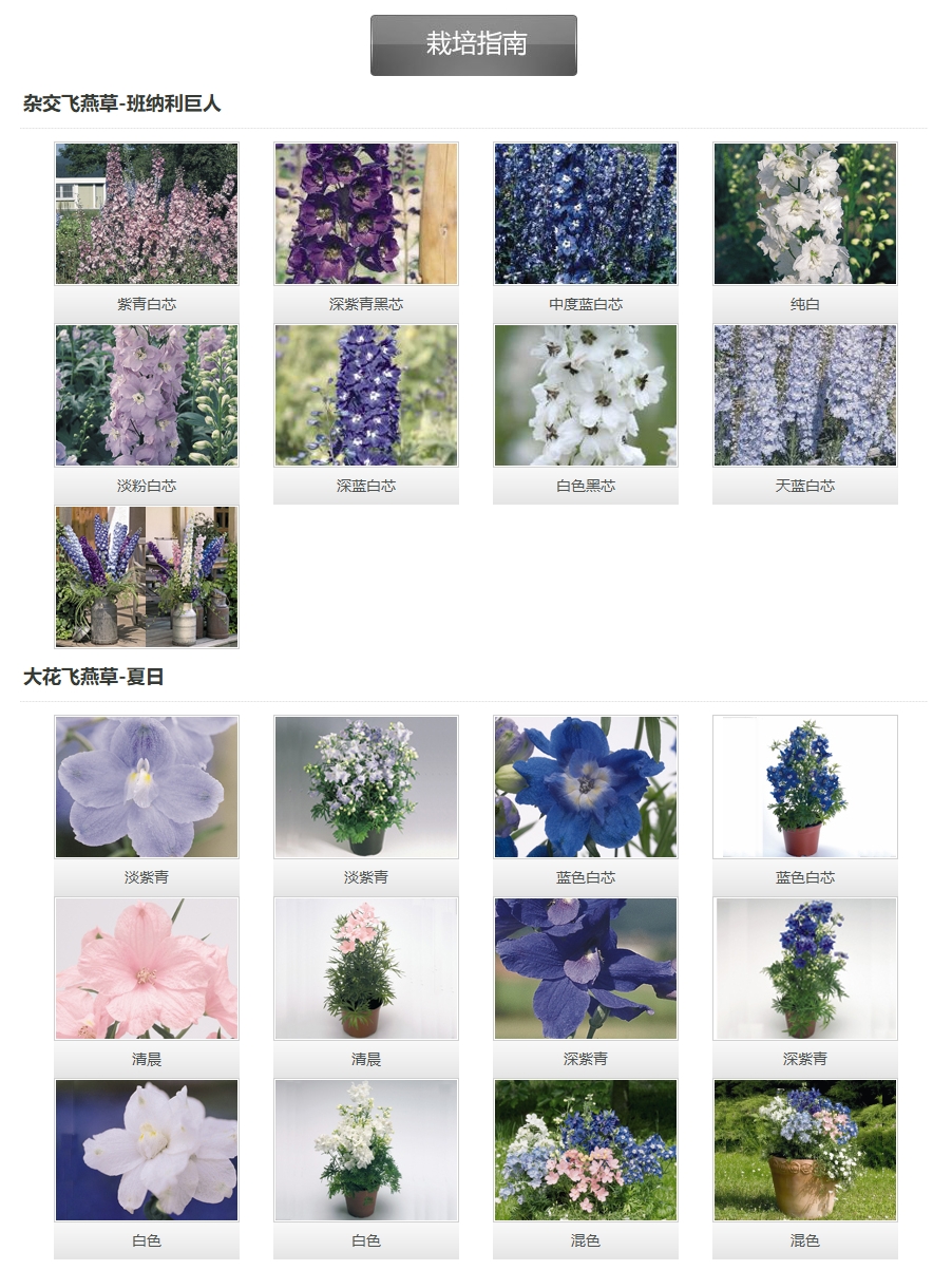株高約30厘米,株型緊湊低矮,分枝性佳,花多且花色吸引人。花期早,耐熱性比其他同類飛燕草更好。五種花色均不需要春化處理且可作一年生栽培。