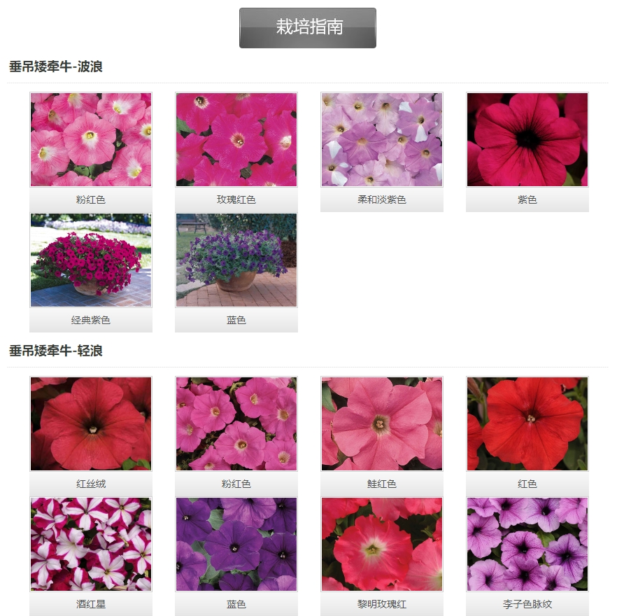 株高15-30厘米,冠幅75-100厘米,花徑5-7厘米, 生長習性整齊一致,花色齊全,生長迅速,花開不斷,能很快長滿花壇,且不需要修剪,耐熱耐寒。不需要特殊的長日照誘導便可以開花,是用途最廣、開花最早的大花垂吊型品種。植株大小容易控制,更容易栽培。地栽時,植株更圓潤,但生長范圍略小。