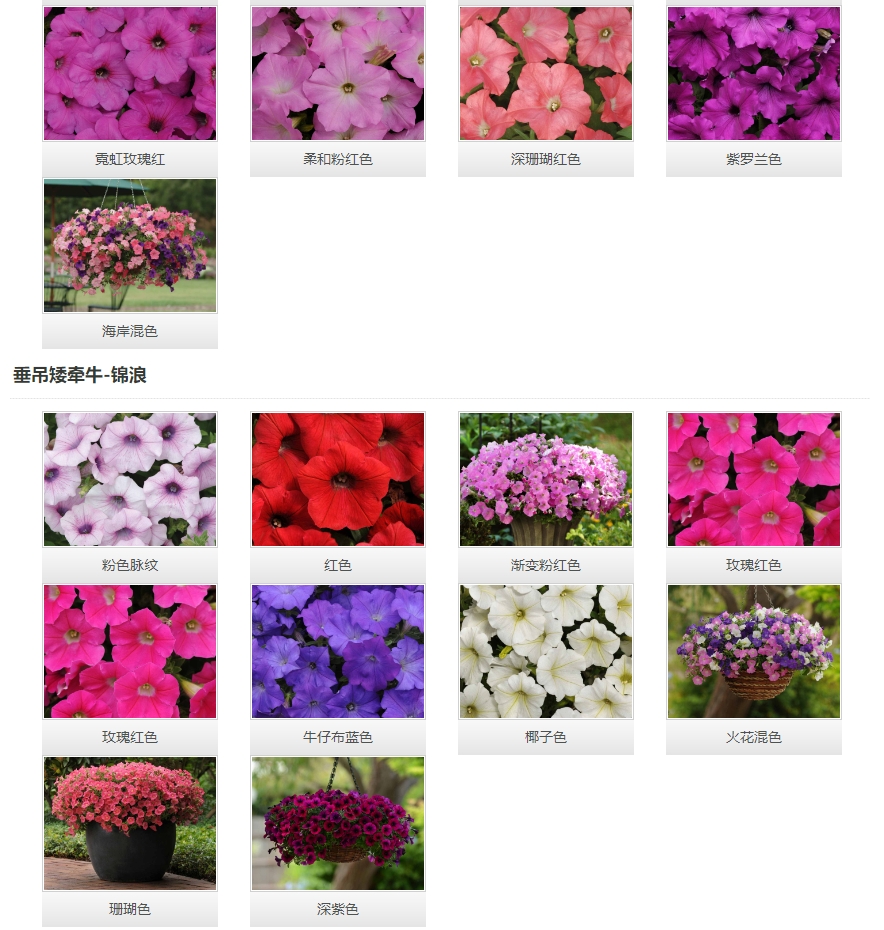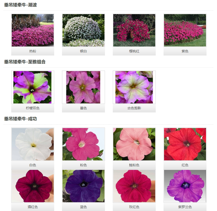 大花、多花型,株高25-35厘米,花開不斷。市場上最早花的垂吊矮牽牛系列,比競爭者早開花7天。花期一致,6天之內整個系列都會開花。