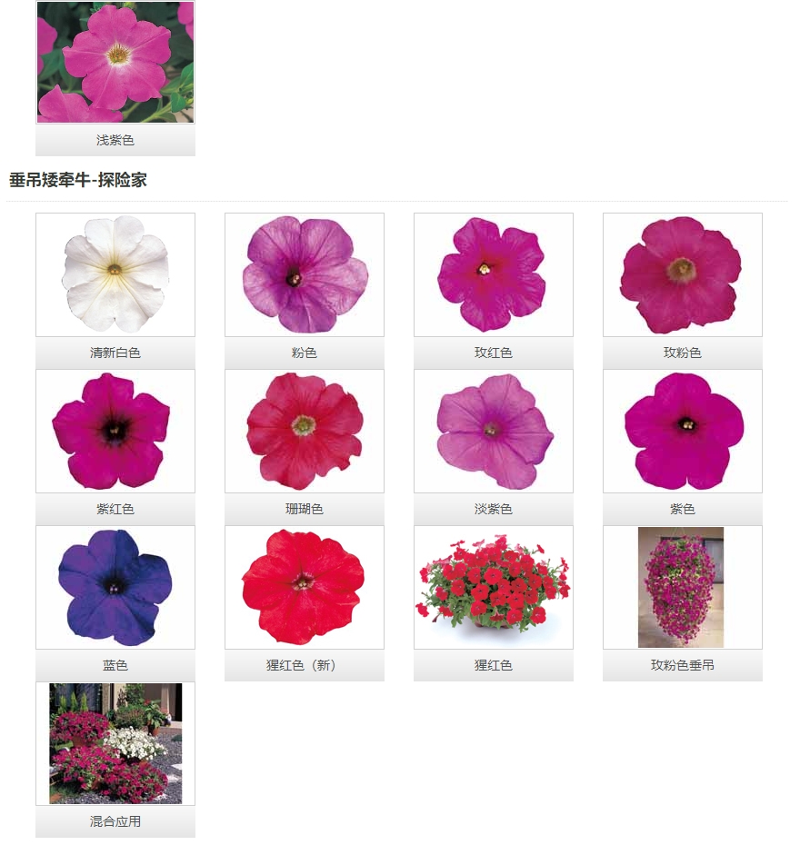 中大花-單瓣型。發芽:25℃,10天,需光。花直徑可達5-7.5厘米。出色的開花能力,春季開花早,花期長,甚至到秋季短日照的條件下依然持續開花。其蔓生和垂吊的植株特性很容易覆蓋地面80-100厘米的區域。耀眼的彩虹色花瓣具有似臘粉的表面組織,防水能力特別強,暴風雨后的植株,恢復能力快。植株中部沒有禿頂現象,并能夠持續開花。植株的耐鹽堿性強,是作為哦海濱植物的理想選擇。探險家系列對風景園林師來說是非常好的地被植物。探險家粉色和探險家紫色于2006年榮獲RHS。