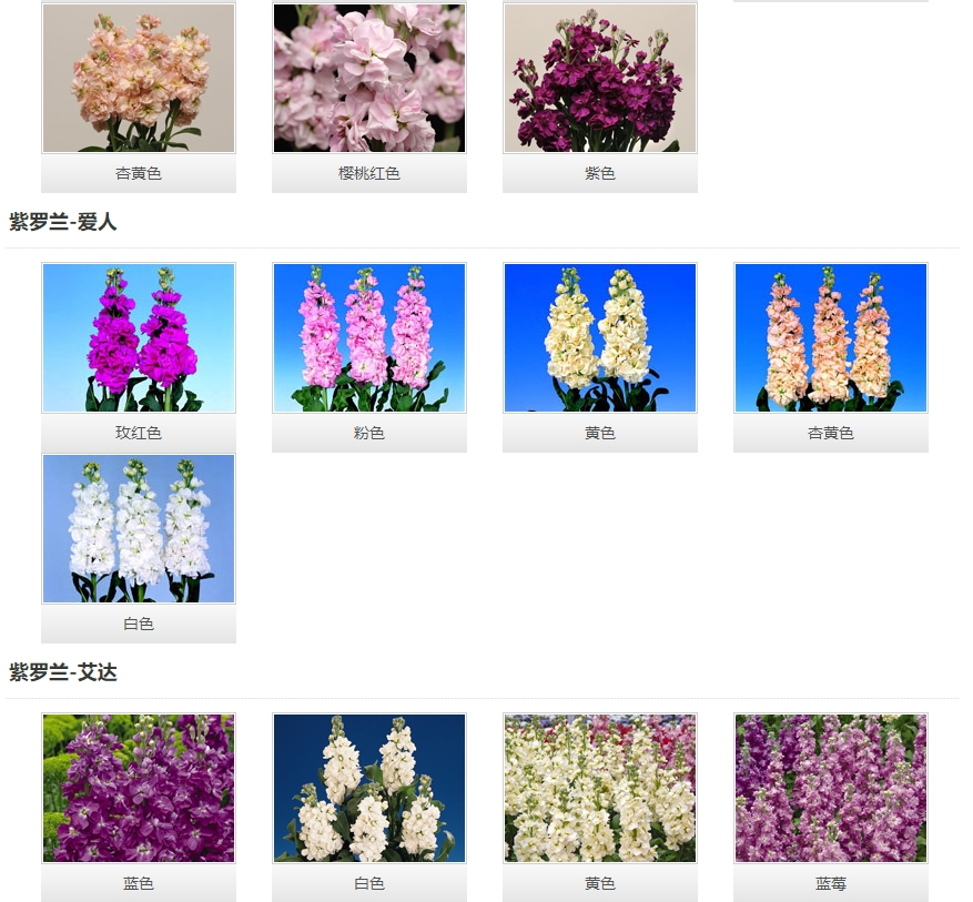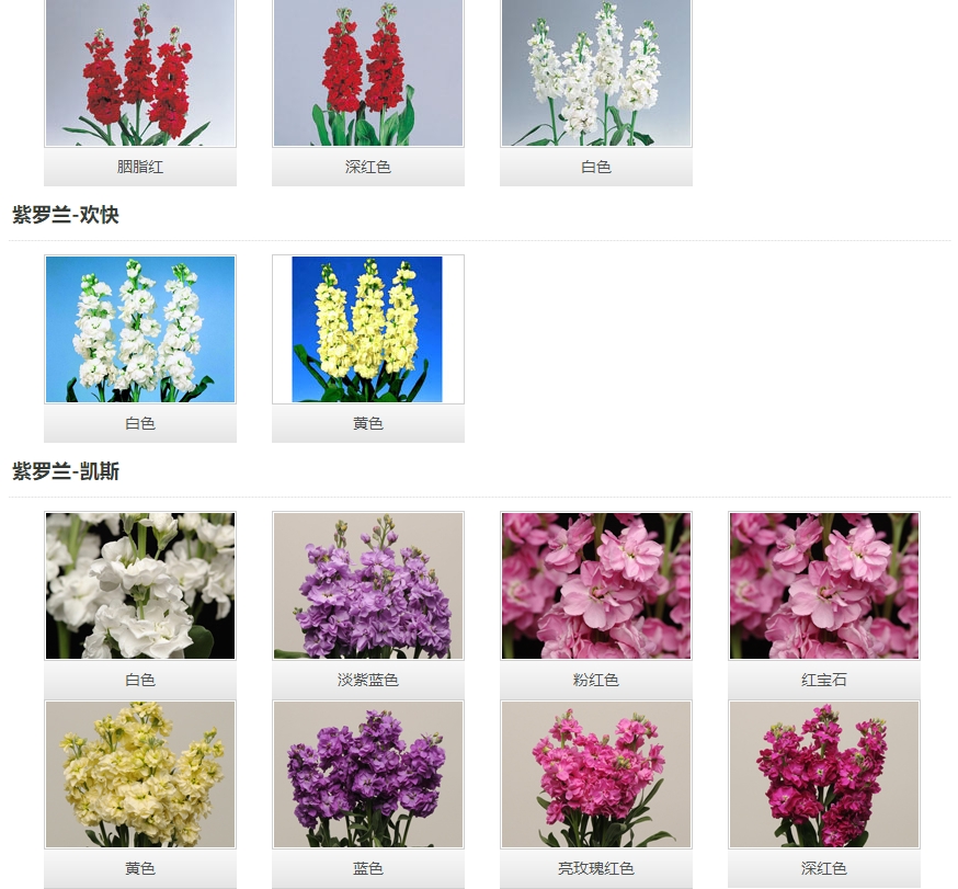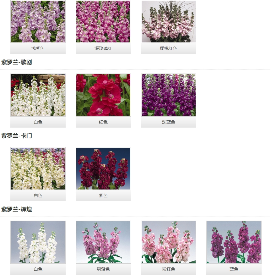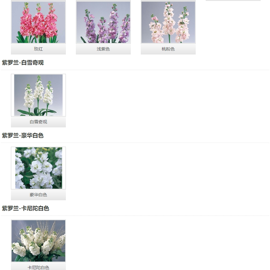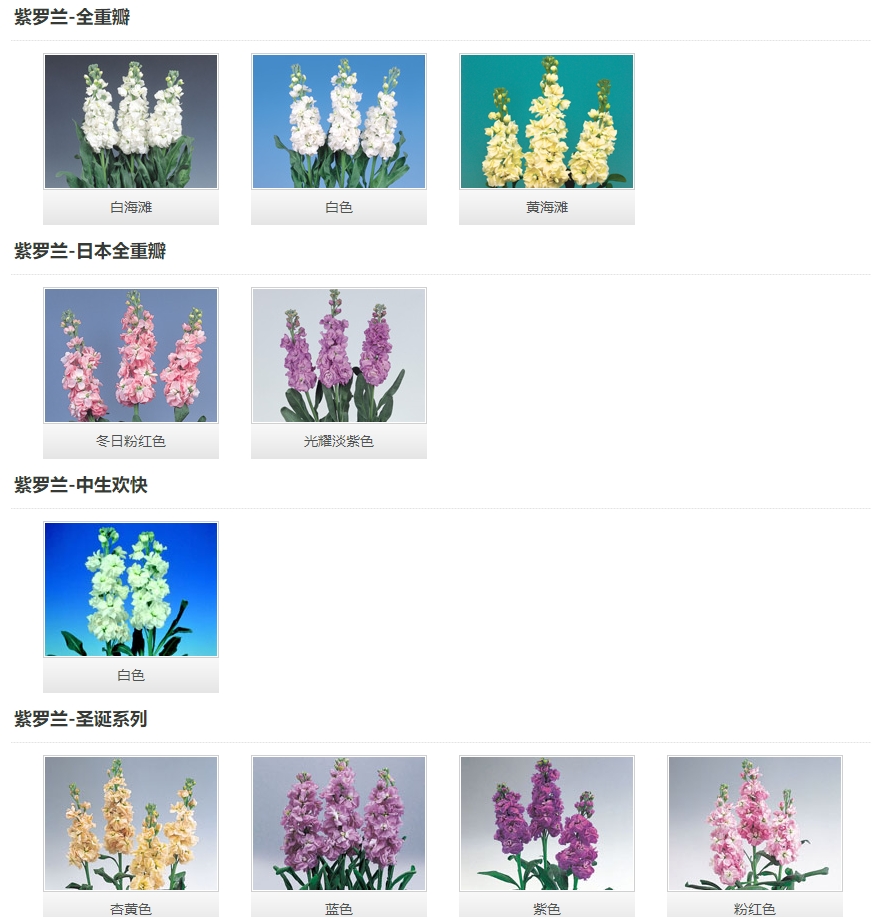 植株強健,整齊。白色的大花在強健的花莖上綻放,毛葉型。 貴族系列 開花極早,高重瓣的貴族系列美得讓人驚嘆。花朵小花簇擁在強健的莖稈上,非常漂亮,生長整齊的貴族系列是花農的最佳選擇。毛葉型。 白雪奇觀 開花極早,花穗上大量的純白色花幾乎同時開放,尤為壯觀,毛葉型。